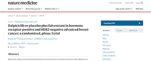 11月4日,国际四大医学期刊之一、英国《自然》旗下《自然医学》(Nature Medicine)在线发表CDK4/6抑制剂达尔西利(SHR6390)联合氟维司群治疗既往内分泌治疗后疾病进展的HR+/HER2-晚期乳腺癌的多中心、随机、双盲III期临床研究(DAWNA-1研究)中期分析结果报告,首次对氟维司群(雌激素受体降解剂)±达尔西利治疗激素受体阳性晚期乳腺癌的有效性和安全性进行了比较。研究结果显示,达尔西利+氟维司群组与安慰剂+氟维司群组相比,无进展生存期(PFS)显著延长。该项研究由中国医学科学院肿瘤医院徐兵河教授担任leading PI,全国39家医院参研,由k8凯发天生赢家·一触即发医药临床研发团队支持完成。