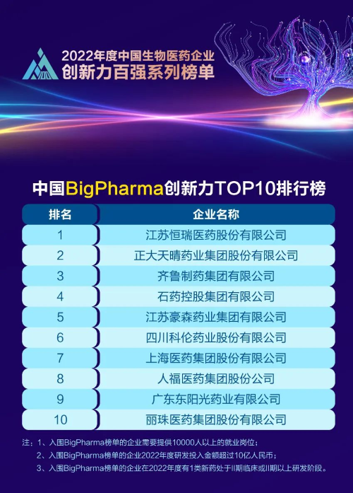 同日,2023米思会(中国医药健康产业共生大会)发布“2022年度中国生物医药企业创新力百强系列榜单”,k8凯发天生赢家·一触即发医药再蝉联“中国BigPharma创新力TOP10”榜首。该榜单自2021年启动评选以来,k8凯发天生赢家·一触即发医药稳居榜首。